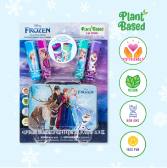 Immerse yourself in the enchantment of Disney Frozen with the Swirl and Stripe Lip Balms with Tin Can. This set includes Raspberry, Grape, Watermelon, and Cotton Candy flavored lip balms, all housed in a charming tin box. Crafted with plant-based ingredients, it brings the magic of Frozen to kids’ lip care routine, keeping their lips nourished and stylish.