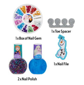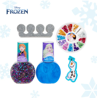 Experience the magic of Disney Frozen with the Water-Based Peelable Nail Kit. This set includes two nail polishes, one with glitters, along with toe spacers, a nail file, and a box of nail gems for creative fun. Let kids embrace their creativity and the spirit of Frozen characters with every stroke and shimmer.